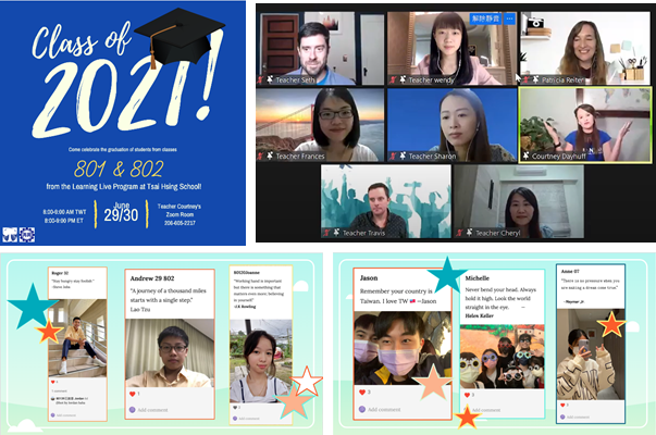 因應新冠肺炎三級警戒,本校八年級數位雙語專班畢業典禮於6月30日(三)線上舉行,典禮於上午八點開始,師生皆透過視訊連線參加,流程包含教師勉勵、授證儀式、頒獎典禮與課程回顧。為了增加學生參與感,典禮中特別穿插畢業生製作的Year book posts,邀請學生分享自己的座右銘,也分段播放學生於典禮前錄製的畢業感言短片,表達對老師及同學的感謝之意,為典禮增添溫馨氣氛。