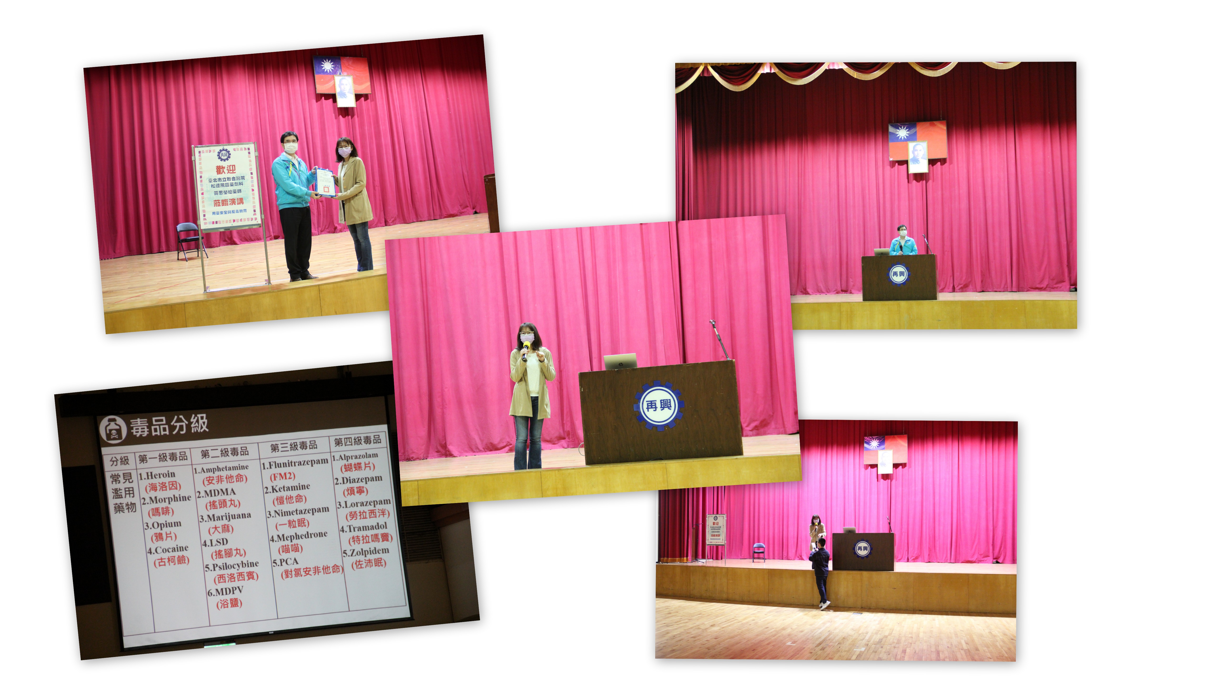 為加強學生對於藥物安全與反毒教育觀念,本次邀請臺北市立聯合醫院松德院區藥劑科黃思瑩總藥師蒞臨本校進行週會宣講;講師首先介紹現今市面上常見毒品類型,使學生對於認識毒品種類及對人體危害有其基本認知,避免讓自己陷入毒害,尤其近年來有關新興(混合型)毒品使用人數增多,再加上不容易化驗,且販毒者故意將其包裝成日常生活用品,或是偽裝成糖果、咖啡奶茶包等裝飾,容易使學生誤食,希望學生要提高警覺,以免誤用。講座在演說過程中加入有獎徵答方式與學生熱絡互動,表現深獲肯定,期望本次校園藥物與反毒宣導能達到初步之成效。