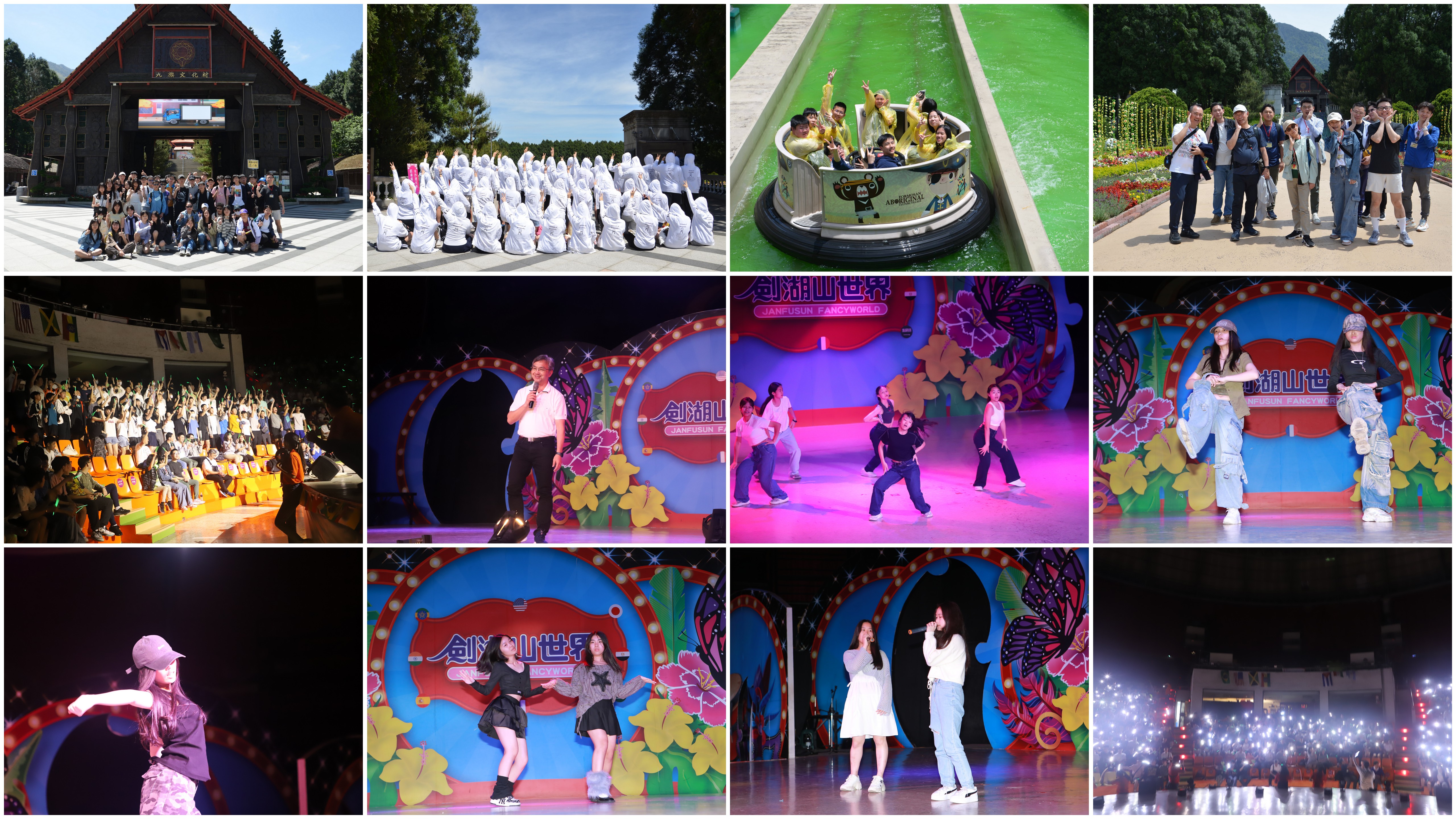 第二天的一早,同學們用過早餐,檢整房務後,前往位於日月潭的九族文化村,一個以臺灣原住民文化為主題所打造的歡樂多元的主題樂園;園區內有原住民文化、歡樂世界、歐洲花園和日月潭纜車等四大主題;師生們在飽覽日月潭風光後,晚上來到了雲林古坑鄉的劍湖山王子飯店住宿,在用過晚餐後,師生一同前往遊樂場的彩虹劇場內觀賞表演;表演結束後,盛大青春晚會在張副校長致詞後正式揭幕;晚會中除了鴻禧旅行社帶領的默契培養活動外,擔任隊輔的哥哥姐姐們更是使出渾身解數進行舞蹈演出;接著,各班同學精心準備的歌舞節目將晚會帶入最高潮;最後,在動人的樂音下,即將分班的同學們珍惜、感謝這難得的緣分,並祝福彼此能有更美好的未來。