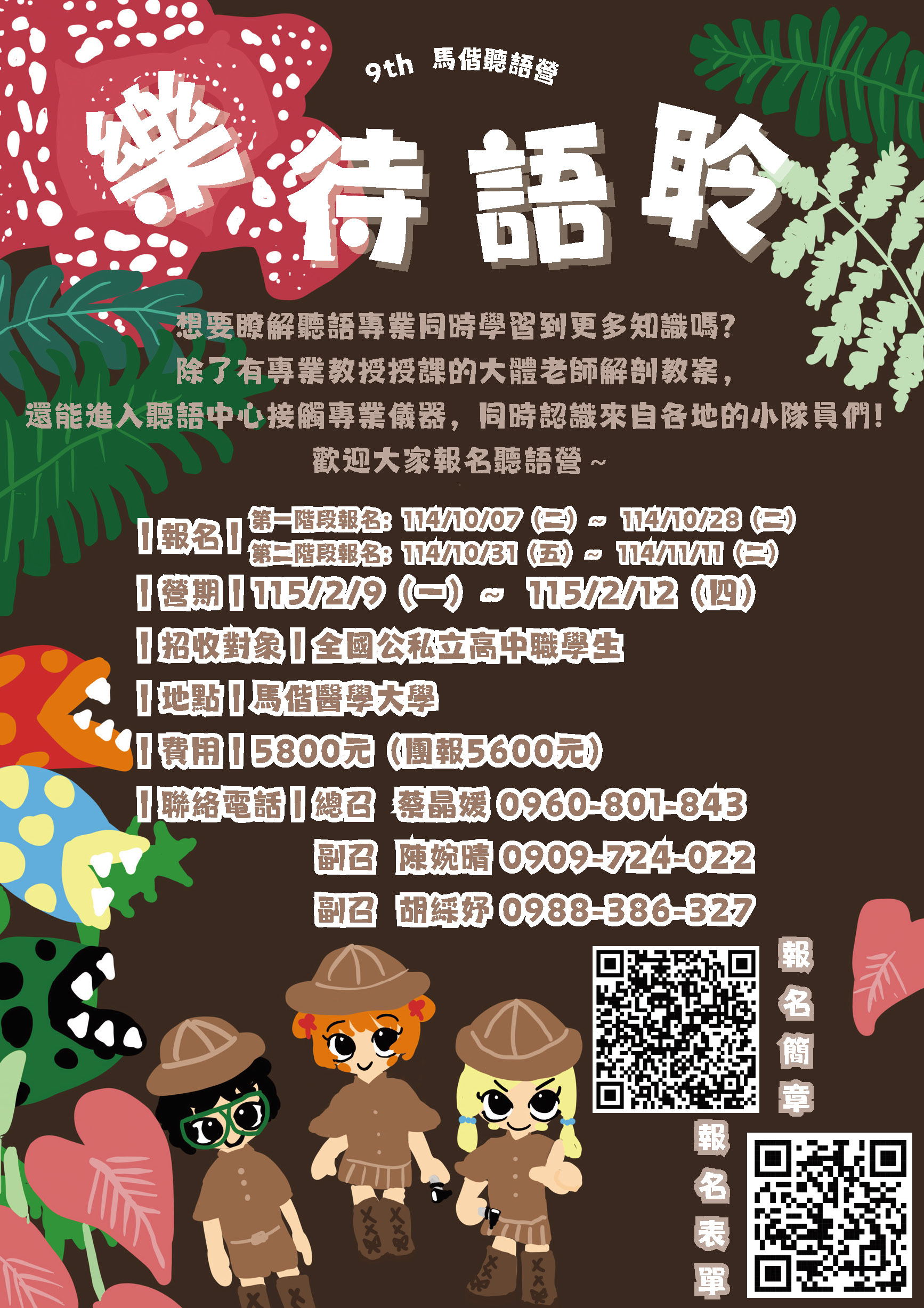 馬偕學校財團法人馬偕醫學大學 函 主旨:檢送本校聽力暨語言治療學系2026年2月9至2月12日舉辦「第九屆馬偕聽語營–樂待語聆」營隊招生活動及海報訊息,敬請惠予協助公告宣傳,並鼓勵同學踴躍參加。 說明: 一、本活動之特色: (一)聽語營期間設計了許多專業知識的教案和活動,期許學員可以藉由參與聽語營,以有趣的方式學習到最正確的專業知識。 (二)藉四天三夜的馬偕生活及學習體驗,讓學員學習專業知識之餘,也體驗到馬偕醫學大學高品質的聽語中心相關設備和家庭式的宿舍環境。 (三)教學和團康活動交叉安排,在有趣的遊戲中獲得樂趣,一方面也可以結交到同齡的好友,學習如何在團隊中表達自己、認識別人。 (四)透過與聽語學系師生的相處,更加了解聽語學系的學習內容以及專業者的熱忱所在。 二、活動資訊: (一)活動日期:2026年2月9日(一)至2月12日(四)。 (二)活動地點:本校馬偕醫學大學(新北市三芝區中正路三段46號)。 三、報名日期: (一)第一階段報名:2025/10/07(二)~10/28(二)。 (二)第二階段報名:2025/10/31(五)~11/11(二)。 四、報名方式:採線上報名,報名表單:https://forms.gle/2Z5YYJicsHQg4LFP9。 五、對象與人數:全國高中職在學生,招收30人。 六、檢附活動報名簡章及海報各1份供參。